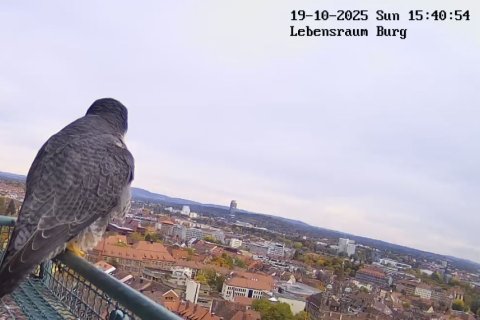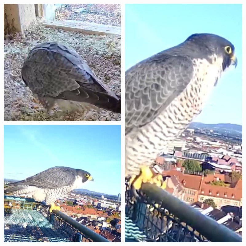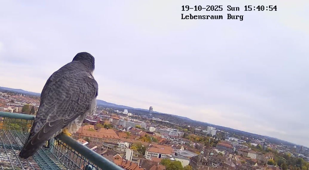 In diesen Wochen endet die Phase, in der die Jungfalken von den Altvögeln lernen. Damit sind die juvenilen Wanderfalken auf sich allein gestellt. In ihrem ersten Winter fliegen sie teilweise Richtung Süden bis nach Spanien oder Portugal. Dieses Jahr scheinen auch bereits alle den Weg angetreten zu haben, da schon länger kein junger Wanderfalke mehr am Horst gesichtet wurde. Die Altvögel bleiben, anders als ihr Name vermuten lässt, meistens im weiteren Umkreis des Reviers, um es zu verteidigen. Es ist also durchaus möglich auch in nächster Zeit immer wieder einen der beiden Altvögel am Horst zu sehen zu bekommen.