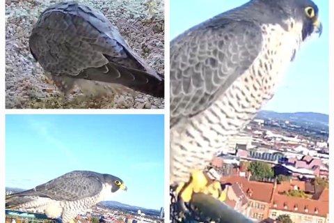 Gegen 9:40 Uhr heute Vormittag kam das dritte Ei dazu. Da Wanderfalkenweibchen in der Regel drei bis vier Eier legen, ist das Gelege nun möglicherweise schon vollständig. Bleibt nur, weiterhin zu beobachten, ob noch ein viertes Ei hinzukommt.