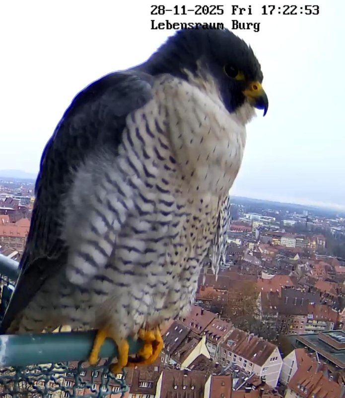 Heute morgen wurden durch ehrenamtliche Beringer der Vogelwarte Radolfzell die vier Jungvögel beringt. Neben dem Anbringen der Ringe werden die Vögel auch gewogen, wodurch sich Aussagen über das Geschlecht machen lassen, da die Männchen etwa ein Drittel leichter sind. Daher auch die Bezeichnung Terzel für männliche Wanderfalken. Dieses Jahr sind zwei männliche (Ringnummern T-GU und T-WC) und zwei weibliche Falken (Ringnummern T-WA und T-WB) aus den Eiern geschlüpft. Auch erste Ergebnisse der seit einigen Jahren laufenden Wanderfalkenberingung in und um Nürnberg haben sich gezeigt. So nistet dieses Jahr ein 2020 beringtes Weibchen vom Flughafen im Kirchturm der St. Pauls Kirche in Fürth. Vielen Dank an die Beringer für ihre wertvolle Arbeit sowie die Burgverwaltung für den reibungslosen Ablauf.