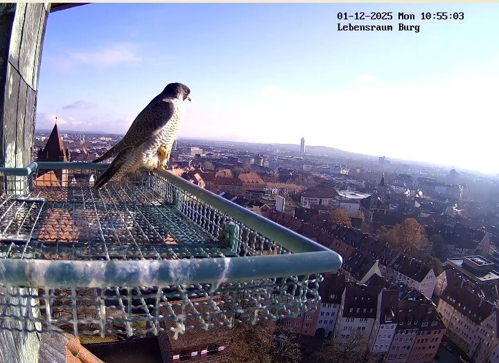 Der Jungvogel saß auf einem der Beleuchtungselemente auf dem Dach des Sinwelturms, widmete sich der Körperflege und hofft wohl wie seine Geschwister darauf, mit Futter versorgt zu werden (beides für Teenager nicht ungewöhnlich). Die beiden Altvögel saßen auf der Wetterfahne der Sebalduskirche und auf dem "Luginsland" und hatten den Nachwuchs von zwei Seiten im Blick - bei Teenagern eher unbeliebt, in diesem Fall jedoch sehr hilfreich. Auch nach dem Ausfliegen der Jungvögel halten die Altvögel meist Blick- oder Rufkontakt. Da der Jungvogel nur knapp unter dem Brutplatz sitzt, wird er vermutlich ebenso wie seine Geschwister versorgt werden.