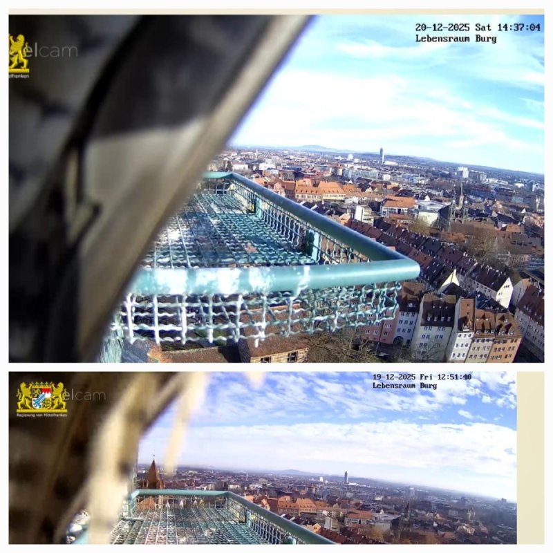 Heute morgen hat auch der letzte Jungvogel den Horst verlassen. Damit beginnt jetzt für alle vier die etwa sechs-wöchige Bettelflugperiode. In dieser Zeit werden sie weiterhin von den Altvögeln mit Nahrung versorgt, trainieren ihre Flugmuskulatur und können immer weitere Strecken zurücklegen, bis sie es letztendlich auch wieder zum Horst hoch schaffen. Gegen Ende der Bettelflugperiode und in den Wochen danach lernen die Jungfalken dann von den Altvögeln das Jagen. Dabei lassen die Altvögel bereits geschlagene Beute fallen, die die Jungvögel fangen müssen. Mit etwas Glück ist so eine Lerneinheit auch mal in der Nähe der Kaiserburg zu beobachten.