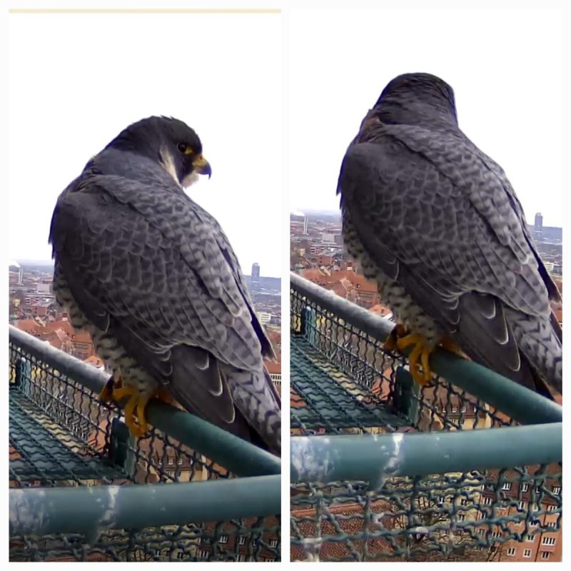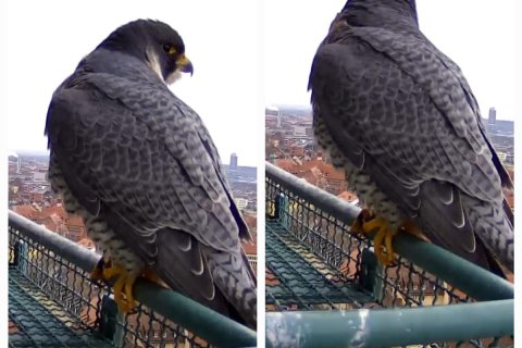 Heute Nacht gegen 2:15 kam das zweite Ei zum Gelege dazu. Die Falken versuchen zu diesem Zeitpunkt immernoch den Schlupszeitpunkt zu synchronisieren, sodass es nach wie vor sein kann, dass die Eier unbebrütet im Horst liegen. Wann wohl das dritte Ei kommt?