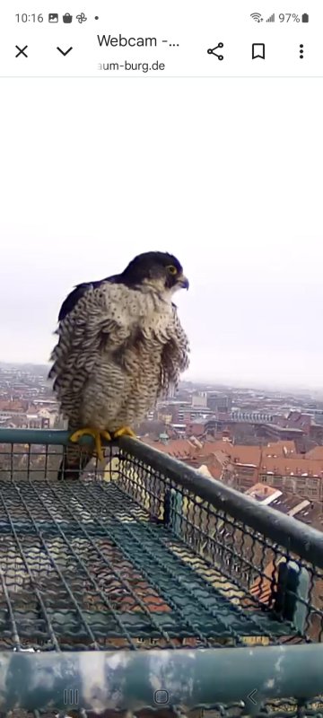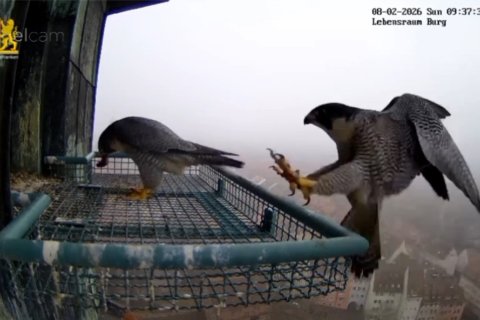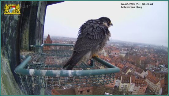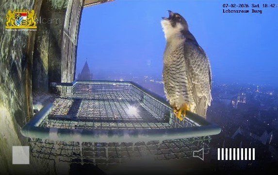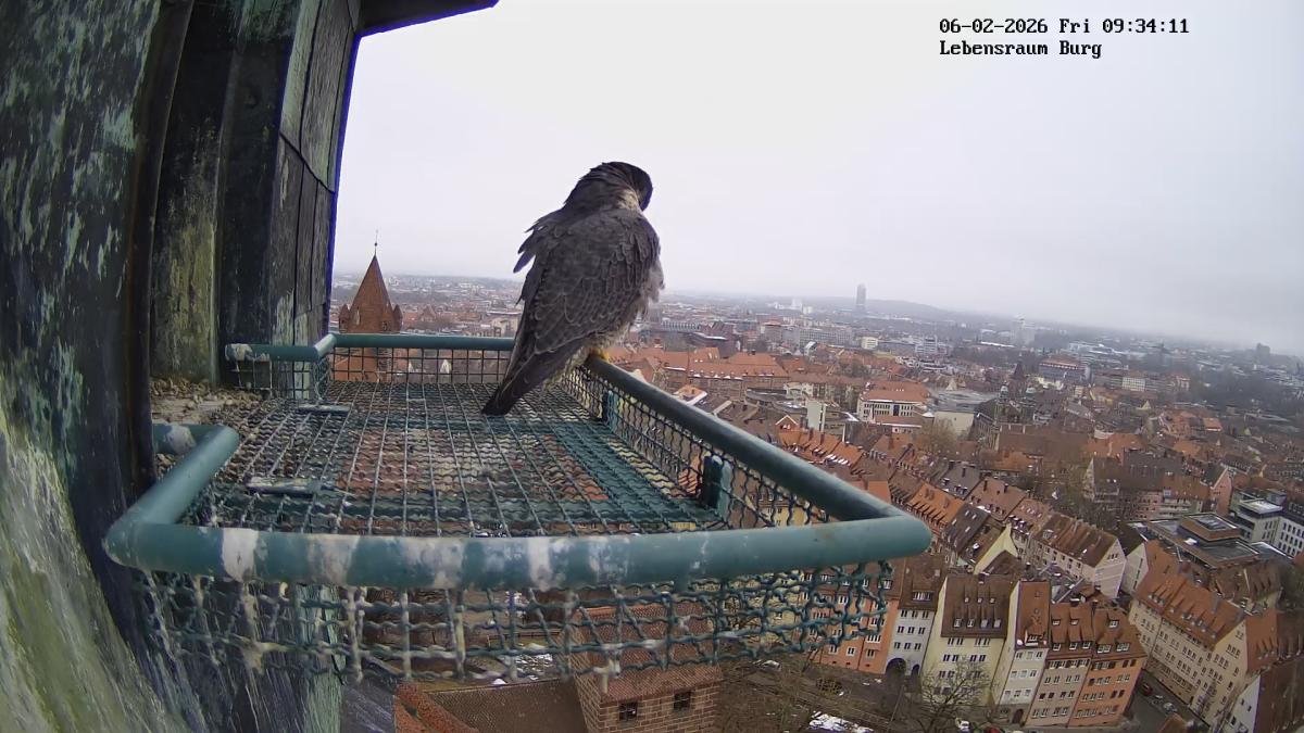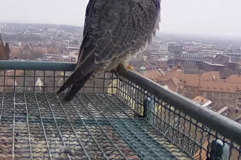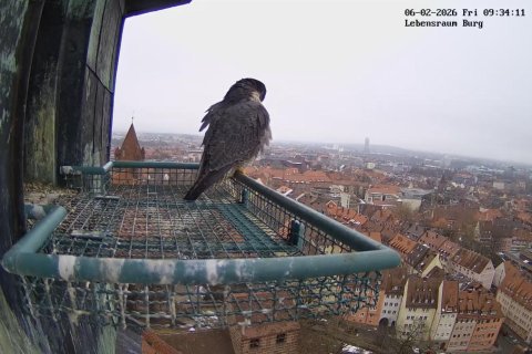 Die Altvögel werden in Abständen weniger Tage immer wieder am Brutplatz gesichtet. Neben Aufenthalten auf dem Anfluggitter oder dem beliebten Platz auf der Kamera, wurden sie auch schon beim 'Mulde drehen', also der Vorbereitung der Brutmulde beobachtet. All das deutet darauf hin, dass es wahrscheinlich auch dieses Jahr wieder zu einer Brut im Dachgeschoss des Sinwellturms kommen wird. Doch die Natur ist nur in gewissem Maße vorhersagbar. Ob tatsächlich wieder Jungvögel schlüpfen, bleibt abzuwarten. Wenn Sie von Wanderfalken nicht genug bekommen können und sich die Zeit bis zum Brutbeginn noch vertreiben möchten, schauen Sie doch mal beim Wanderfalkenquiz vorbei, lernen die weiteren Burgbewohner und ihre Lebensräume kennen oder begeben Sie sich mit natur.digital auf die Suche nach weiteren Wanderfalkennistplätzen in der Nürnberger Umgebung.