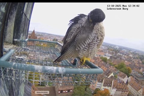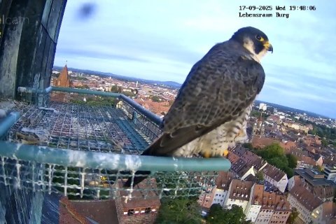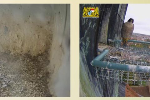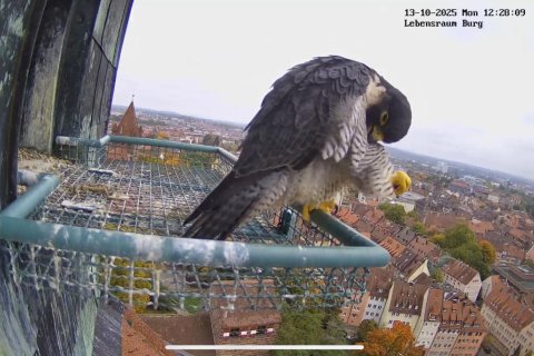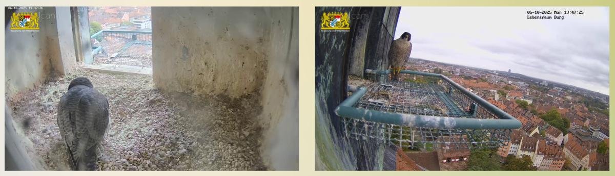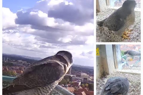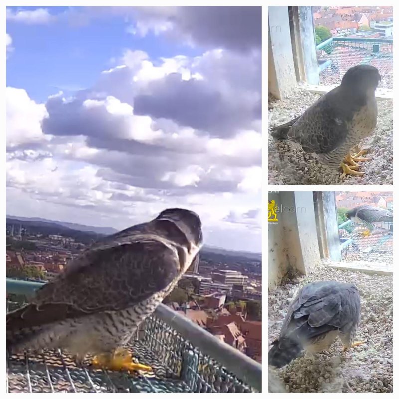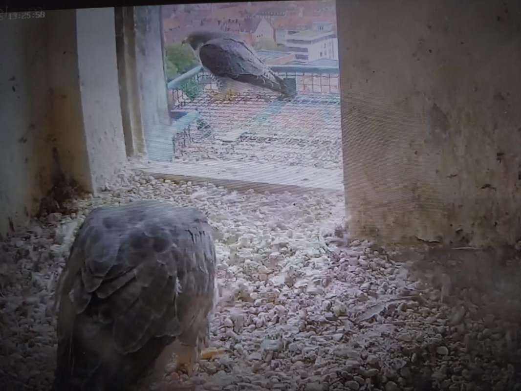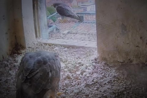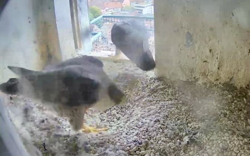 Heute werkelt der Terzel den ganzen Tag auf dem Balkon herum, äugt hin und her, fliegt mal kurz weg und akzickt immer wieder lautstark. Später kommt die Falkin und dreht innen Mulden, der Terzel bleibt draussen hocken...