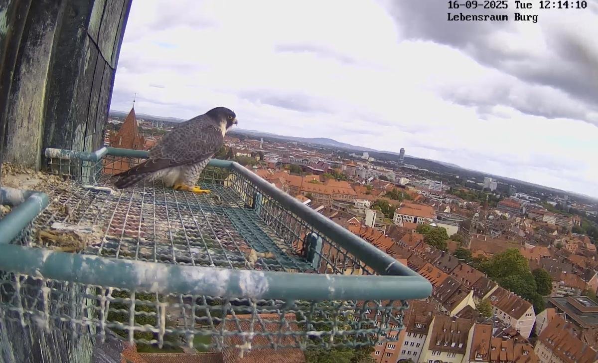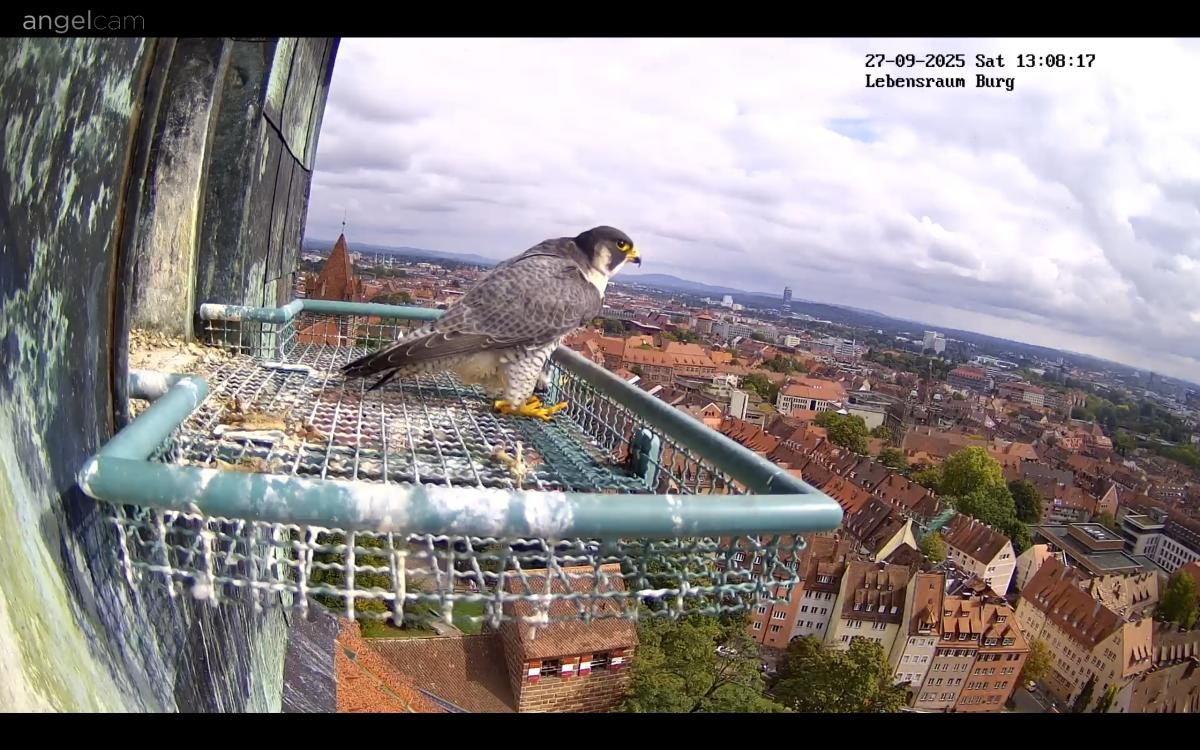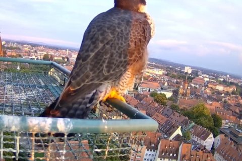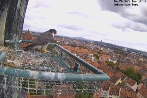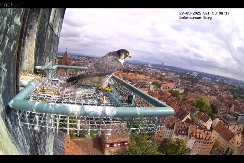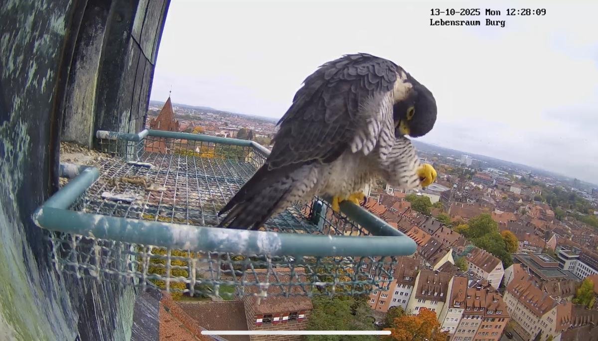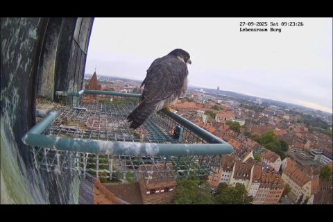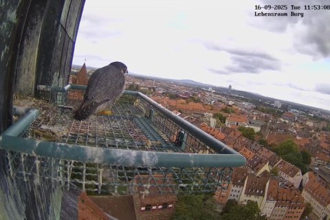 Heute werkelt der Terzel den ganzen Tag auf dem Balkon herum, äugt hin und her, fliegt mal kurz weg und akzickt immer wieder lautstark. Später kommt die Falkin und dreht innen Mulden, der Terzel bleibt draussen hocken...