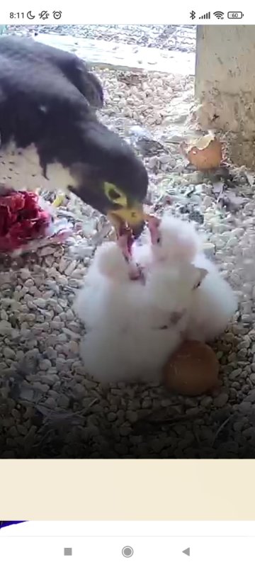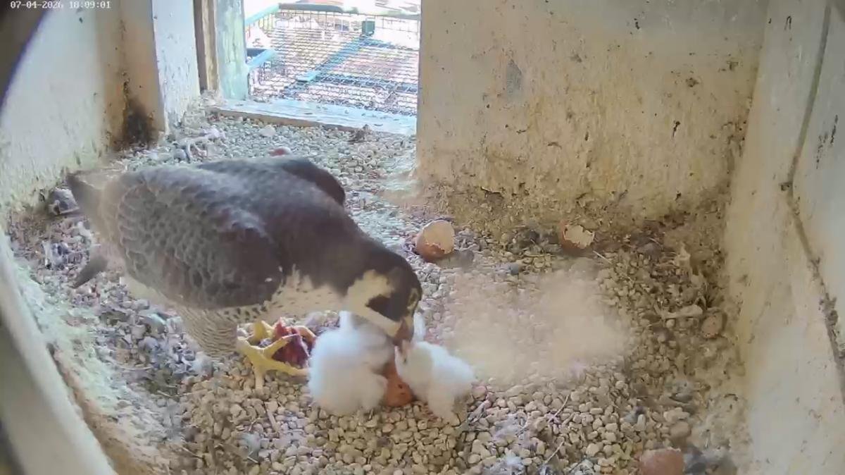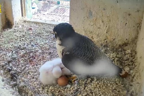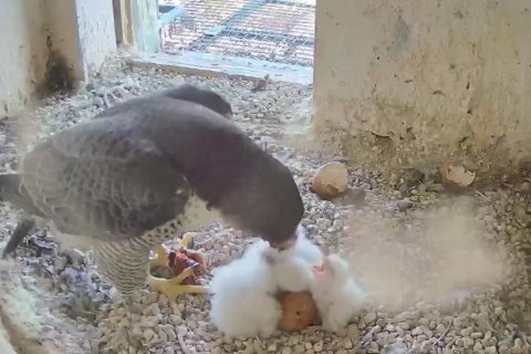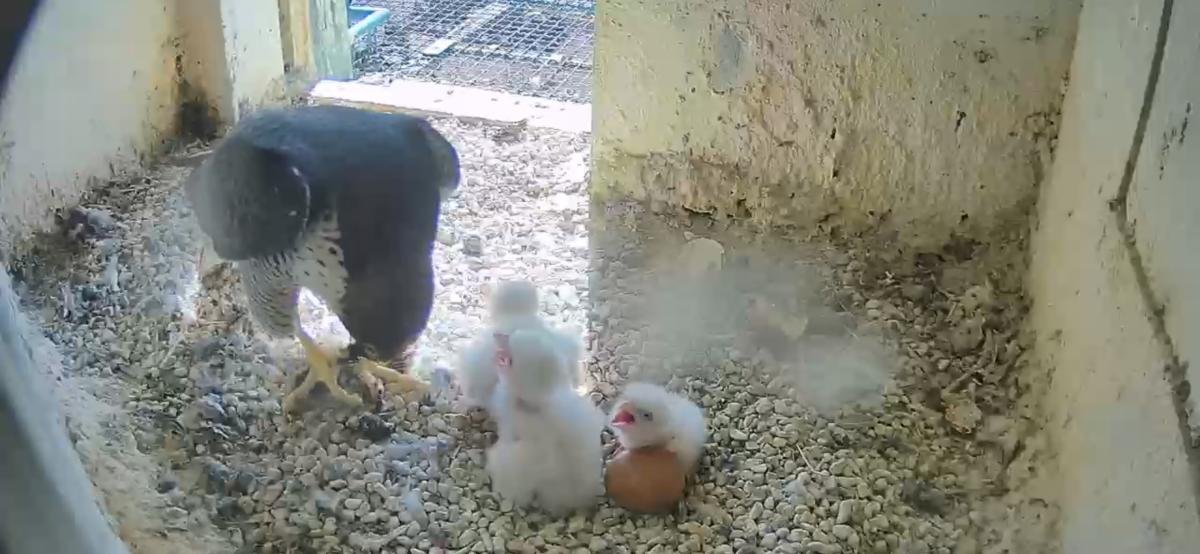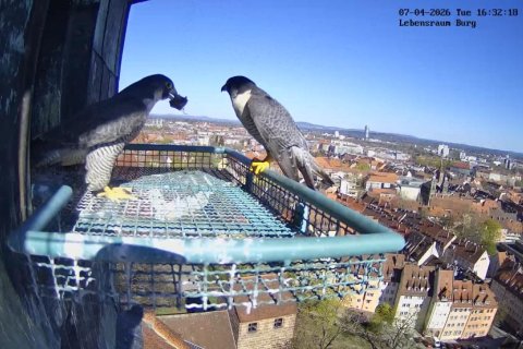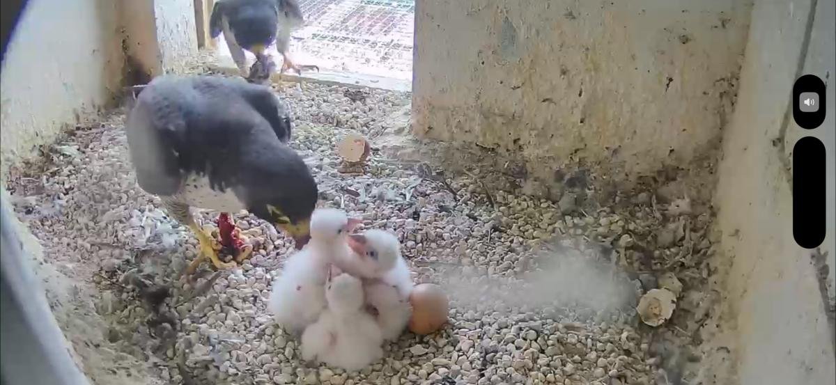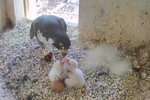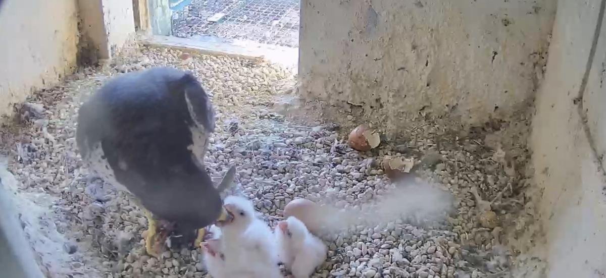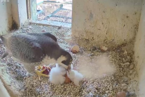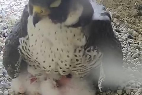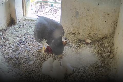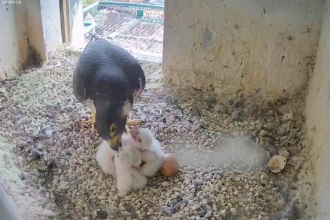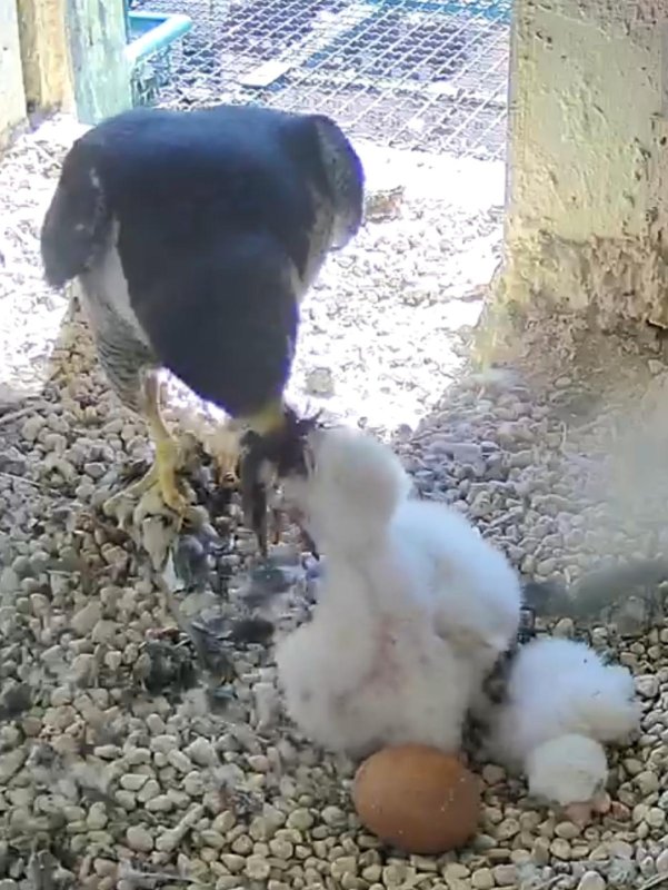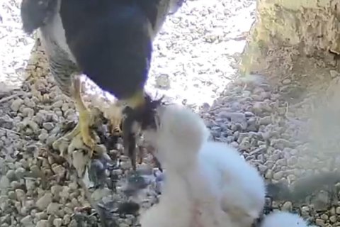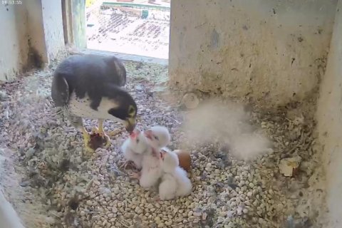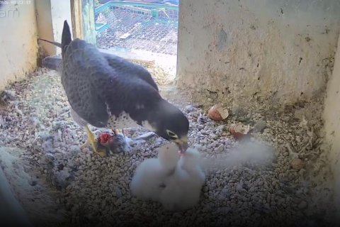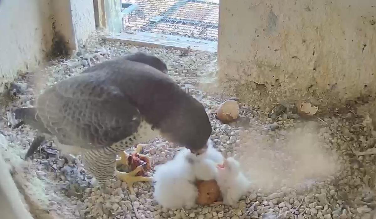 Die Falkenmutter ist gerade noch am Verteilen einer Mahlzeit. Da bringt der Falkenvater nochmal Nachschub.