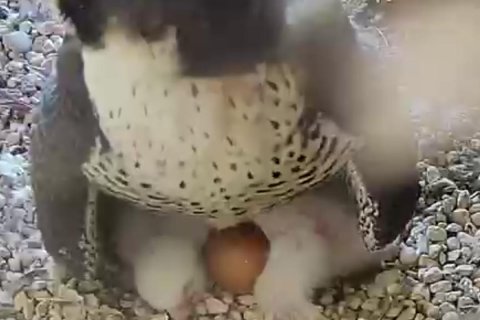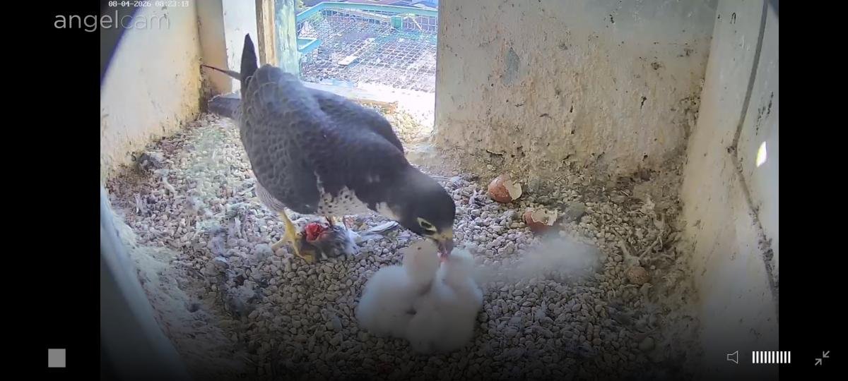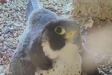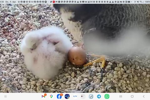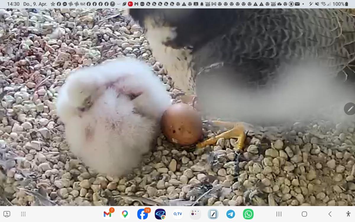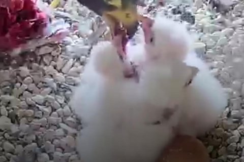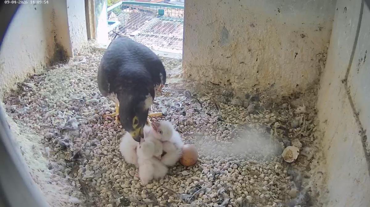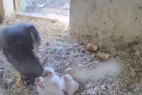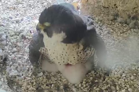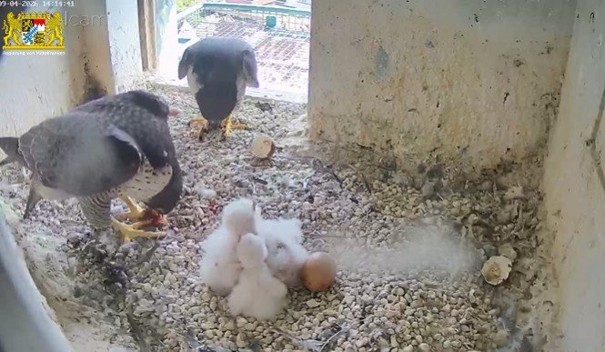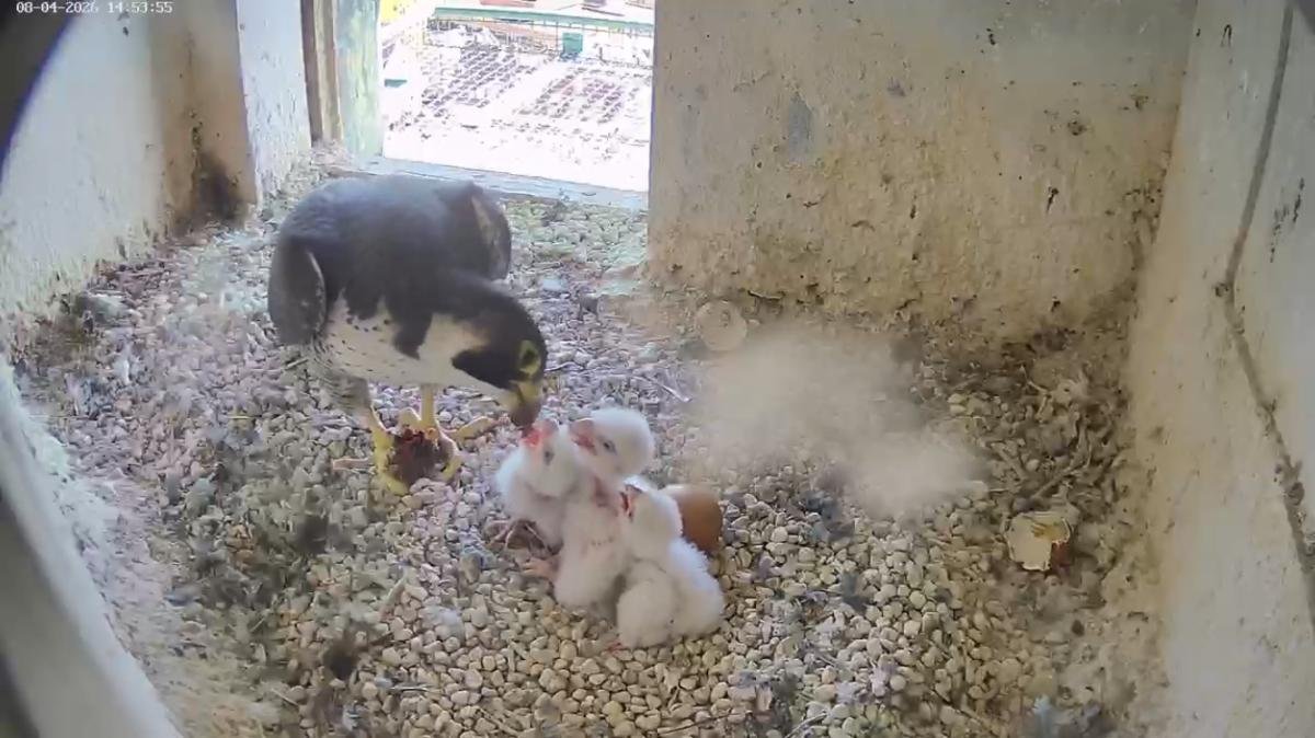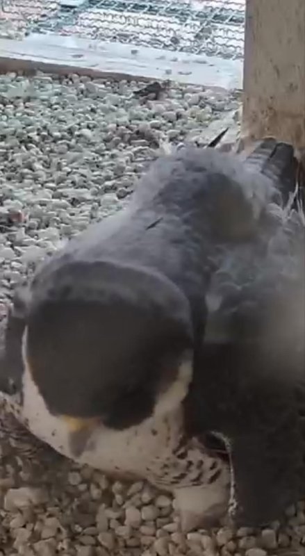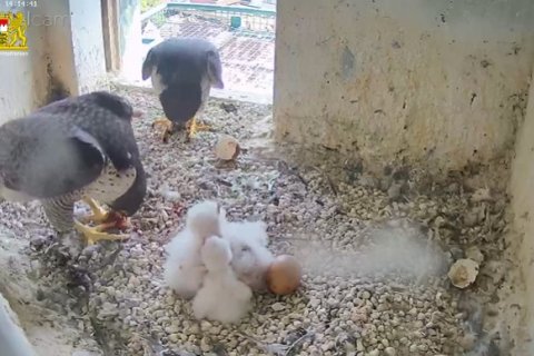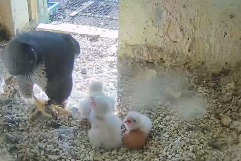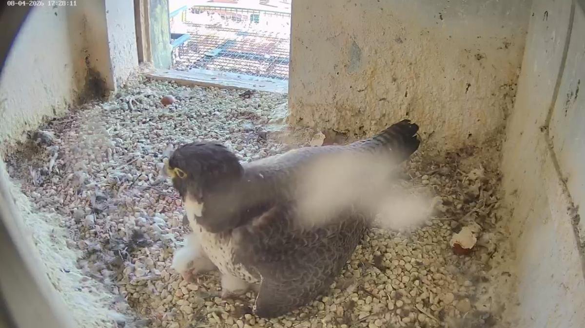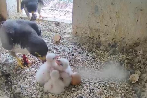 Die Falkenmutter ist gerade noch am Verteilen einer Mahlzeit. Da bringt der Falkenvater nochmal Nachschub.