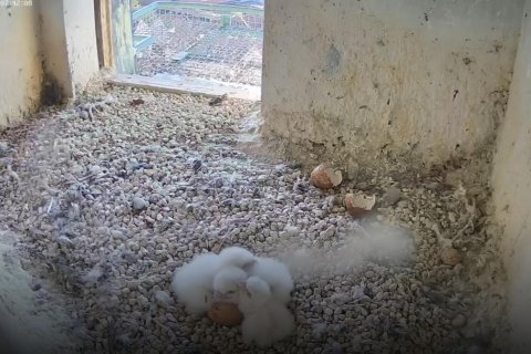 Fast alle im Nest der Familie dösen nach dem reichlichen Mahl: Nur eines schaut vorwitzig unter dem Federkleid der Falken hervor und ist noch munter.