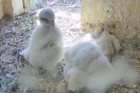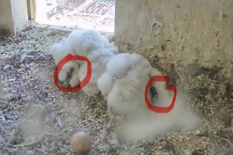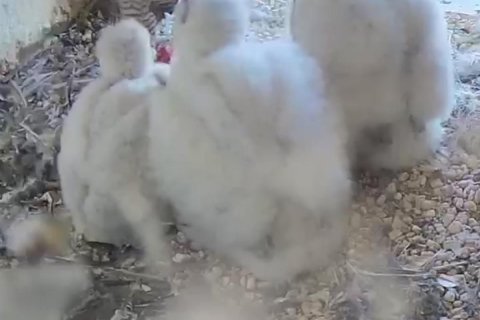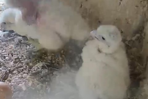 Während ein größeres Küken die Gegend erkundet und sich das andere sonnt, zerlegt das Kleine in aller Ruhe ein Stück Fleisch, das ihre Eltern dagelassen haben
