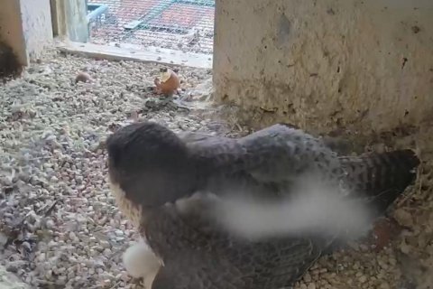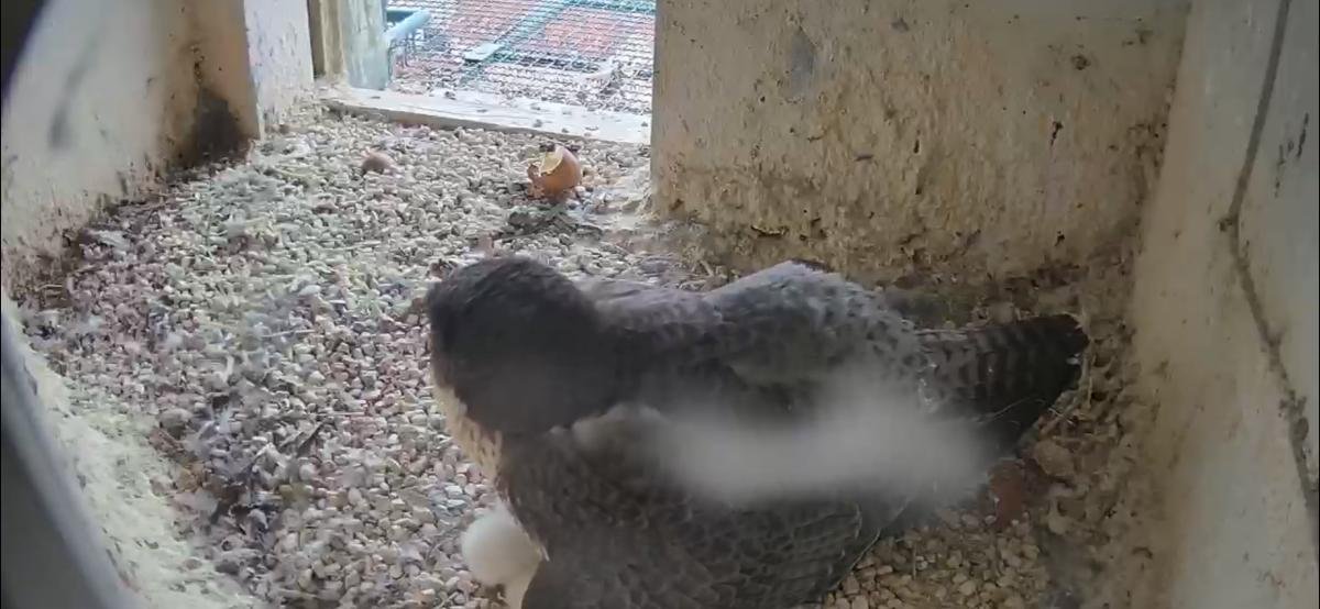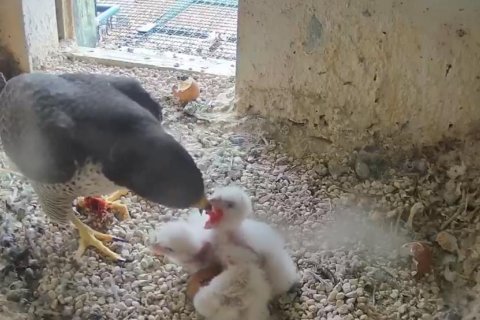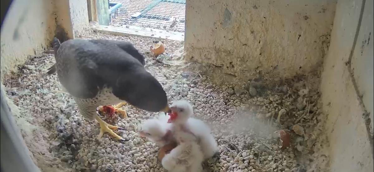 Die Falkenmutter ist gerade noch am Verteilen einer Mahlzeit. Da bringt der Falkenvater nochmal Nachschub.
