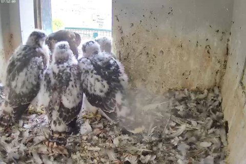 Unsere vier kleinen Wanderfalken haben sich in den ersten zwei Wochen gut entwickelt und wurden fleißig gefüttert. Man sieht die vier Jungvögel nun auch häufiger für kurze Zeit alleine am Brutplatz. Um ihre empfindlichen, derzeit noch spärlich mit Flaum bedeckten Innenseiten zu schützen, stellen sie sich zu einer sogenannten "Wärmepyramide" zusammen.