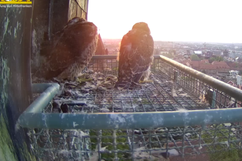 Seit heute Morgen ist ein viertes Ei zu sehen. Die Wanderfalken an der Kaiserburg haben in den letzten Jahren durchschnitlich 3 - 4 Eier gelegt. Ist das Gelege damit vollständig oder werden unsere Wanderfalken noch eines drauflegen?