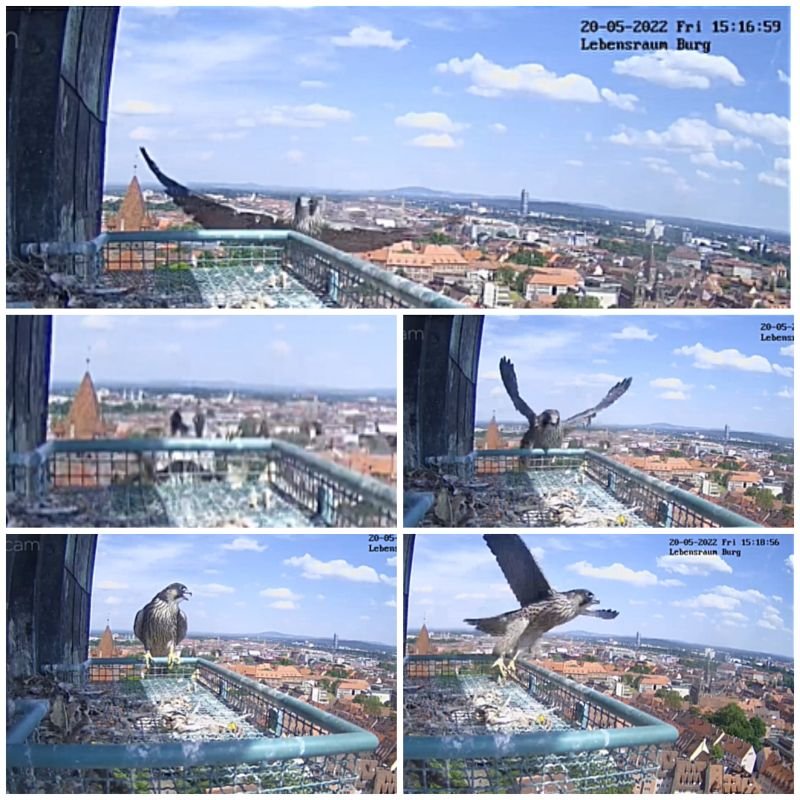 Was für ein schöner Moment: Heute Morgen gegen 6:30 Uhr haben sich die Jungvögel auf das Abfluggitter getraut und gemeinsam die ersten Sonnenstrahlen genossen. Die jungen Wanderfalken trainieren derzeit fleißig ihre Flugmuskulatur, manche auch schon auf dem Abfluggitter. Wann wird der oder die Erste den Absprung wagen? Letztes Jahr flog der erste Jungvogel am 17. Mai aus.
