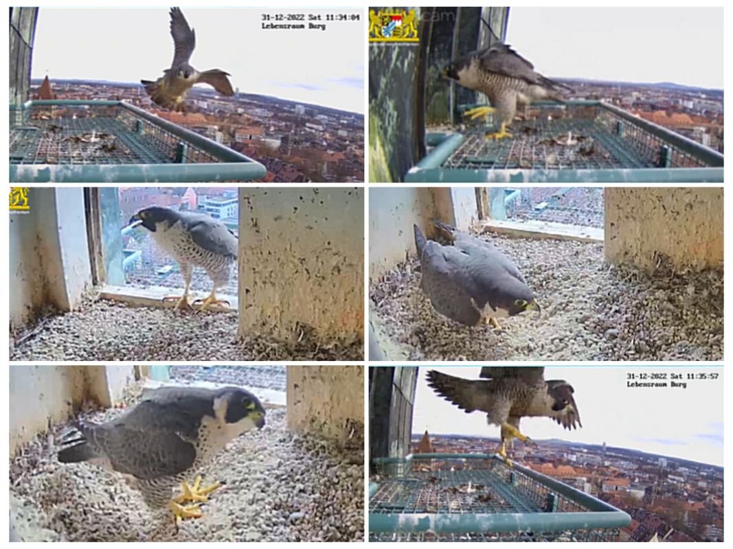 Da werden allem Anschein nach schon fleißig Balzflüge vollführt 😊 Die Mama landet "akzick"-rufend am Brutplatz und fliegt nach 10 Sekunden wieder ab. 3 Minuten später sind beide Altvögel übereinander fliegend am Himmel zu sehen, der Terzel dreht ab, die Mama trifft erneut rufend am Brutplatz ein, positioniert sich im Hauseingang und fliegt nach 1 1/2 Minuten wieder ab 😊beide Altvögel