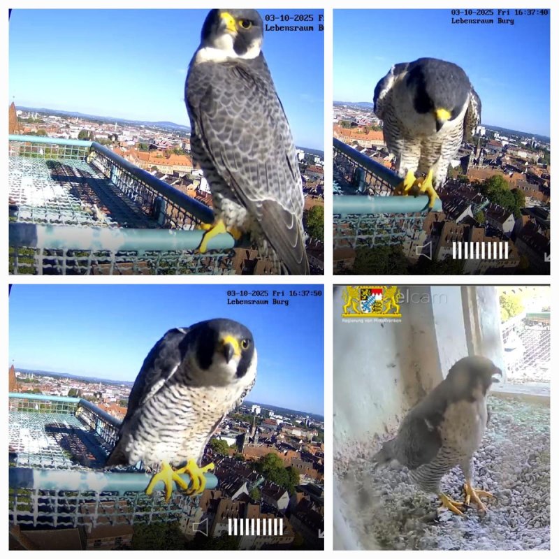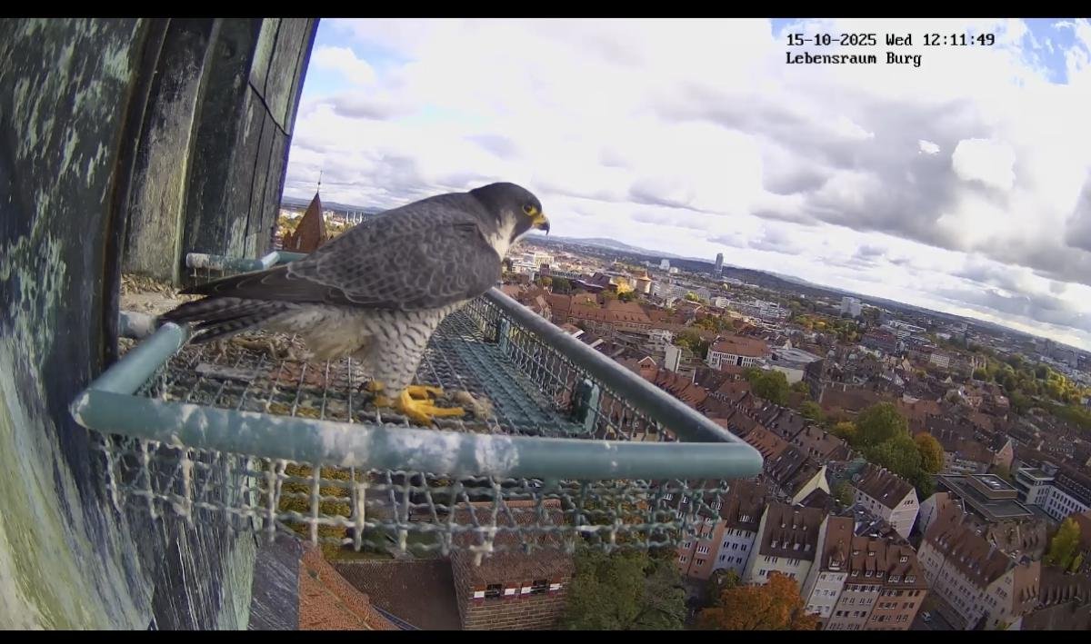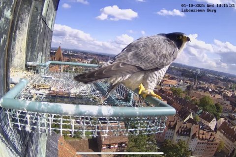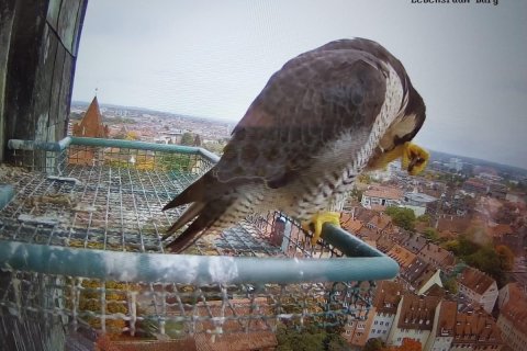 Heute morgen hat auch der letzte Jungvogel den Horst verlassen. Damit beginnt jetzt für alle vier die etwa sechs-wöchige Bettelflugperiode. In dieser Zeit werden sie weiterhin von den Altvögeln mit Nahrung versorgt, trainieren ihre Flugmuskulatur und können immer weitere Strecken zurücklegen, bis sie es letztendlich auch wieder zum Horst hoch schaffen. Gegen Ende der Bettelflugperiode und in den Wochen danach lernen die Jungfalken dann von den Altvögeln das Jagen. Dabei lassen die Altvögel bereits geschlagene Beute fallen, die die Jungvögel fangen müssen. Mit etwas Glück ist so eine Lerneinheit auch mal in der Nähe der Kaiserburg zu beobachten.