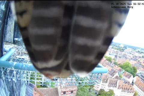 Innerhalb der letzten Stunde haben zwei weitere Jungvögel das Nest verlassen. Was teilweise wie ein Absturz aussieht, ist zu einem gewissen Teil auch nur Unbeholfenheit. In den letzten Tagen hat man die Jungvögel viel mit den Flügeln schlagen sehen, um die Flugmuskulatur zu trainieren. Um tatsächlich zu fliegen braucht es aber auch noch weitere Fähigkeiten, die sich auf einem Abfluggitter nicht üben lassen. Deshalb kann der erste Abflug vom Horst auch etwas unbeholfen und demensprechend wie ein Absturz aussehen. Die drei Jungvögel außerhalb des Horstes stehen weiterhin in Kontakt mit den Altvögeln und werden von ihnen versorgt. In den kommenden Tagen werden die Jungvögel weiterhin ihre Flugmuskulatur trainieren, sodass sie demnächst auch längere Strecken zurücklegen und auch wieder zum Horst zurückkehren können. Viel Erfolg!