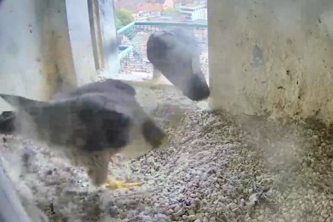 Vor etwa einem Monat hat das Wanderfalkenweibchen das erste Ei gelegt. Seitdem wechseln sich die beiden Altvögel mehrmals täglich ab, um die Eier warm zu halten, wobei das Weibchen den höheren Brutanteil hat. Wenn alles gut geht, sollte im Laufe der nächsten Woche das erste Küken schlüpfen. Ob es sich jedoch am Anfang oder am Ende der Woche aus dem Ei schält, lässt sich nicht genau sagen.