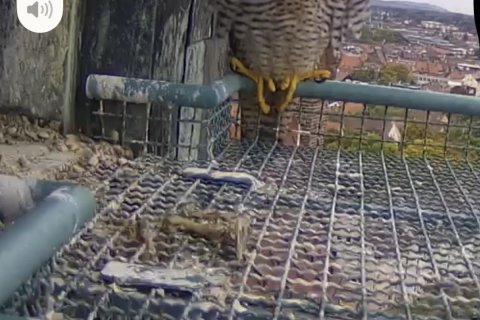 Nachdem das erste Ei gestern Abend unter dem Weibchen zu sehen war, lag es teilweise auch ohne die wärmende Bauchdecke der Falken im Horst. Dabei besteht aber kein Grund zur Sorge, da dieses Verhalten vollkommen normal ist. Der Grund dafür liegt in der Synchronisation des Schlupfzeitpunktes. Während die Eiablage über einen Zeitraum von etwa einer Woche erfolgt, schlüpfen die Küken in nur etwa vier Tagen. Damit geht die Strategie der Falken offensichtlich auf.