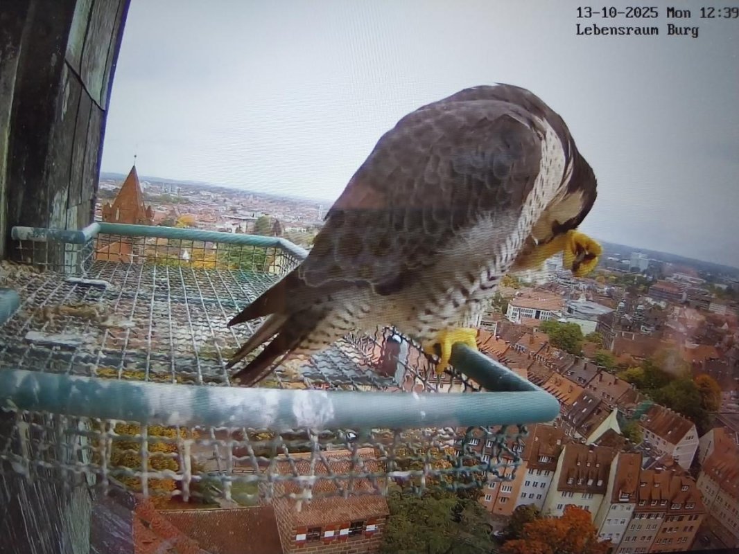 Der Jungvogel saß auf einem der Beleuchtungselemente auf dem Dach des Sinwelturms, widmete sich der Körperflege und hofft wohl wie seine Geschwister darauf, mit Futter versorgt zu werden (beides für Teenager nicht ungewöhnlich). Die beiden Altvögel saßen auf der Wetterfahne der Sebalduskirche und auf dem "Luginsland" und hatten den Nachwuchs von zwei Seiten im Blick - bei Teenagern eher unbeliebt, in diesem Fall jedoch sehr hilfreich. Auch nach dem Ausfliegen der Jungvögel halten die Altvögel meist Blick- oder Rufkontakt. Da der Jungvogel nur knapp unter dem Brutplatz sitzt, wird er vermutlich ebenso wie seine Geschwister versorgt werden.