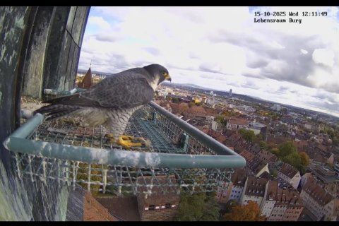 Heute morgen wurden durch ehrenamtliche Beringer der Vogelwarte Radolfzell die vier Jungvögel beringt. Neben dem Anbringen der Ringe werden die Vögel auch gewogen, wodurch sich Aussagen über das Geschlecht machen lassen, da die Männchen etwa ein Drittel leichter sind. Daher auch die Bezeichnung Terzel für männliche Wanderfalken. Dieses Jahr sind zwei männliche (Ringnummern T-GU und T-WC) und zwei weibliche Falken (Ringnummern T-WA und T-WB) aus den Eiern geschlüpft. Auch erste Ergebnisse der seit einigen Jahren laufenden Wanderfalkenberingung in und um Nürnberg haben sich gezeigt. So nistet dieses Jahr ein 2020 beringtes Weibchen vom Flughafen im Kirchturm der St. Pauls Kirche in Fürth. Vielen Dank an die Beringer für ihre wertvolle Arbeit sowie die Burgverwaltung für den reibungslosen Ablauf.