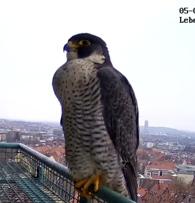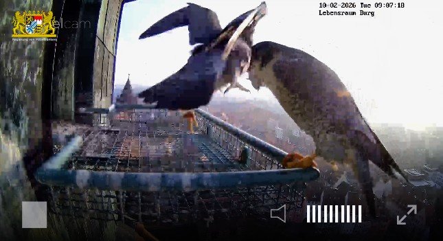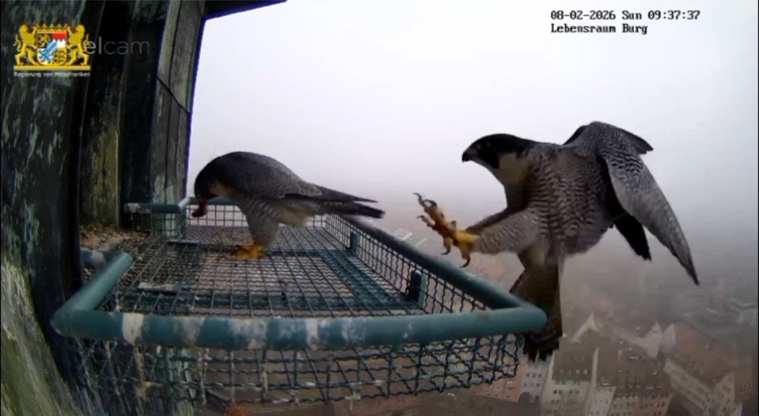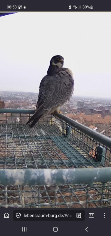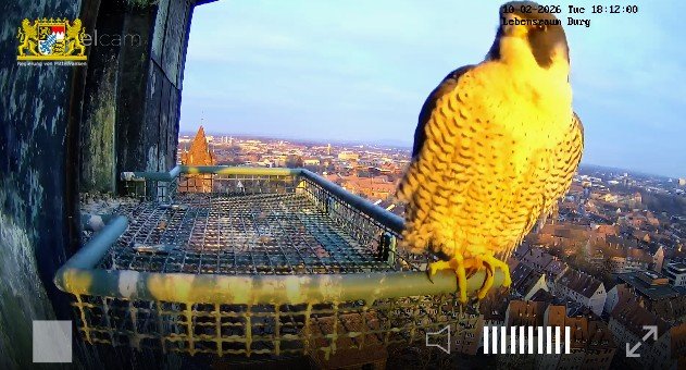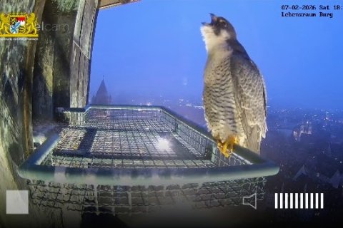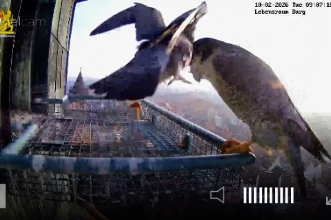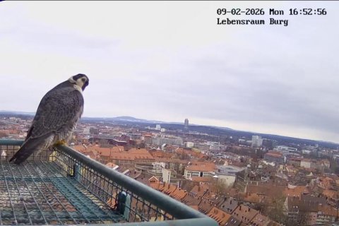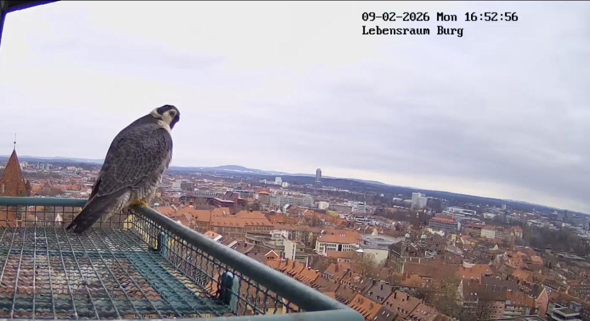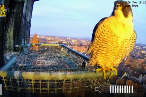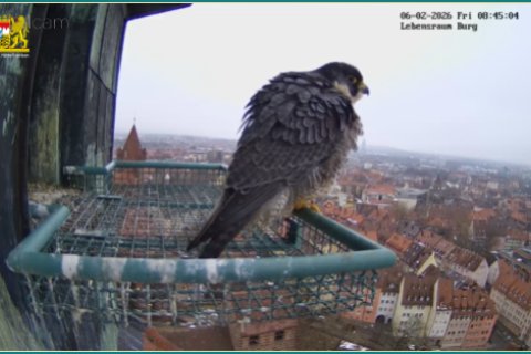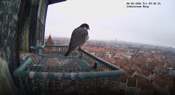 Die Altvögel werden in Abständen weniger Tage immer wieder am Brutplatz gesichtet. Neben Aufenthalten auf dem Anfluggitter oder dem beliebten Platz auf der Kamera, wurden sie auch schon beim 'Mulde drehen', also der Vorbereitung der Brutmulde beobachtet. All das deutet darauf hin, dass es wahrscheinlich auch dieses Jahr wieder zu einer Brut im Dachgeschoss des Sinwellturms kommen wird. Doch die Natur ist nur in gewissem Maße vorhersagbar. Ob tatsächlich wieder Jungvögel schlüpfen, bleibt abzuwarten. Wenn Sie von Wanderfalken nicht genug bekommen können und sich die Zeit bis zum Brutbeginn noch vertreiben möchten, schauen Sie doch mal beim Wanderfalkenquiz vorbei, lernen die weiteren Burgbewohner und ihre Lebensräume kennen oder begeben Sie sich mit natur.digital auf die Suche nach weiteren Wanderfalkennistplätzen in der Nürnberger Umgebung.