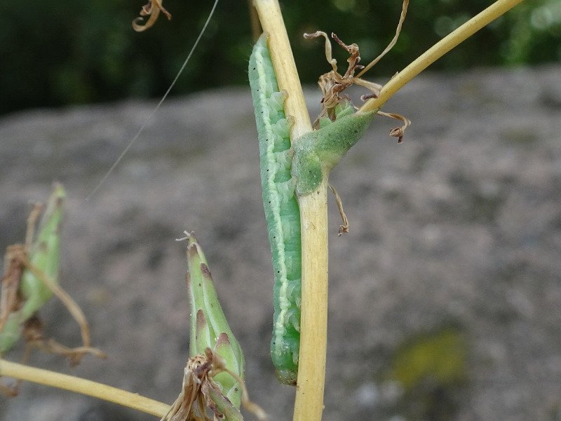 Die Raupe der Kompasslatticheule, eines Nachtschmetterlings, ruht gut getarnt an den Stengeln des Kompasslattich, dessen Blütenknopsen und Früchte sie verzehrt.