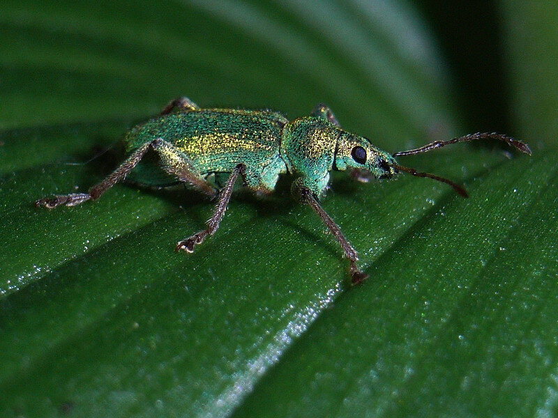 Ein Vertreter der Blattrüssler ist dieser irisierend grün-beschuppte Rüsselkäfer.
