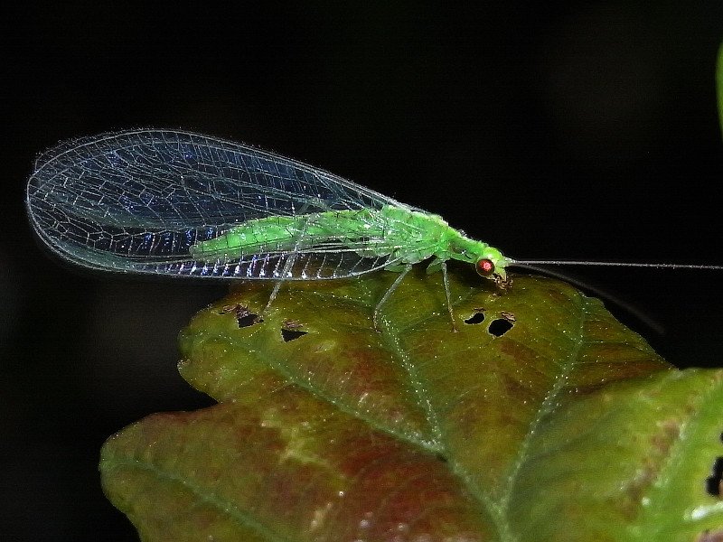 Die Gemeine Florfliege, ein hellgrüner Blattlausjäger, verfärbt sich im Herbst rötlich und sucht zur Überwinterung Schutz in Häusern.