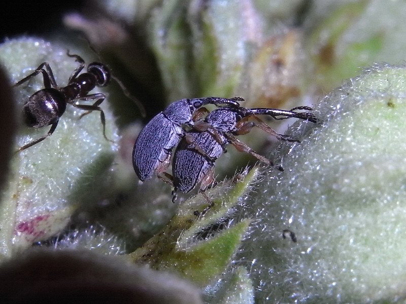 Der Malven-Langrüssler, eine eingewanderte Art, wurde an Stockrosen im Küblerzwinger der Stadtmauer in Anzahl gefunden.
