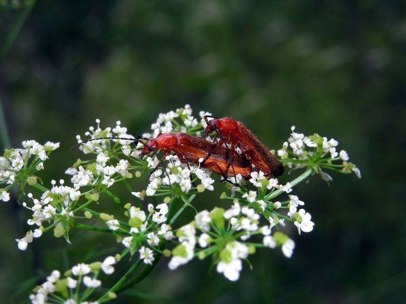 Der Rotgelbe Weichkäfer bei der Paarung auf einem Doldenblütler. Aus Mitteleuropa sind zahlreiche Arten aus der Familie Weichkäfer bekannt, die nur schwer mithilfe von Genitaluntersuchungen zu unterscheiden sind.
